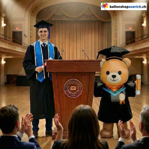 ¡Este oso se mantiene firme por sí solo! Con más de 1,50 metros de altura, es el compañero perfecto para fotos de graduación. Luce con orgullo toga, birrete y diploma, y no necesita ataduras. Simplemente ínflelo, colóquelo y maravíllese: la decoración ideal para la entrada o junto a la mesa de regalos.