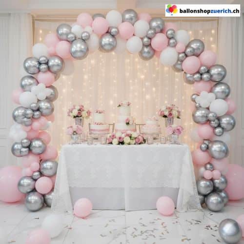 Esta guirnalda de globos combina un suave rosa pastel con el clásico blanco y un elegante plateado. Sus tamaños, de 12 a 25 cm, crean profundidad y dimensión, aportando un toque elegante a cualquier evento. Perfecta para ocasiones románticas como bodas, cumpleaños o baby showers.
