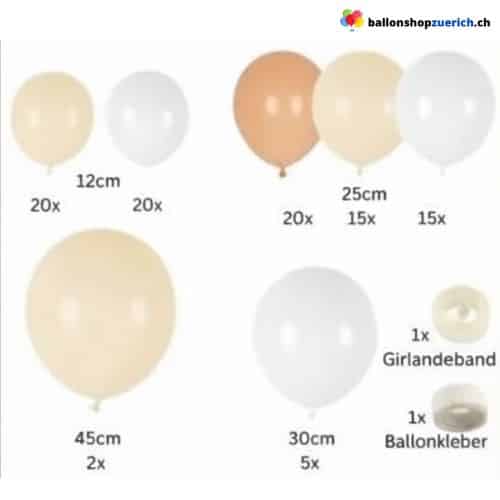 L'elegante combinazione di calde tonalità caramello, crema chiaro, nude e bianco classico crea un'atmosfera moderna ma festosa. Diverse dimensioni, da 12 a 45 cm, aggiungono profondità e dimensione. Perfette come arco di palloncini o come sfondo per eventi eleganti.