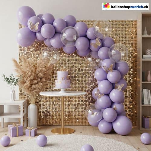 Il delicato viola macaron abbinato a palloncini trasparenti e farfalle 3D conferisce a questa ghirlanda un aspetto fiabesco. Diverse dimensioni, da 12 a 45 cm, creano profondità e volume. Perfetta come sfondo o come elemento di richiamo per eventi romantici.