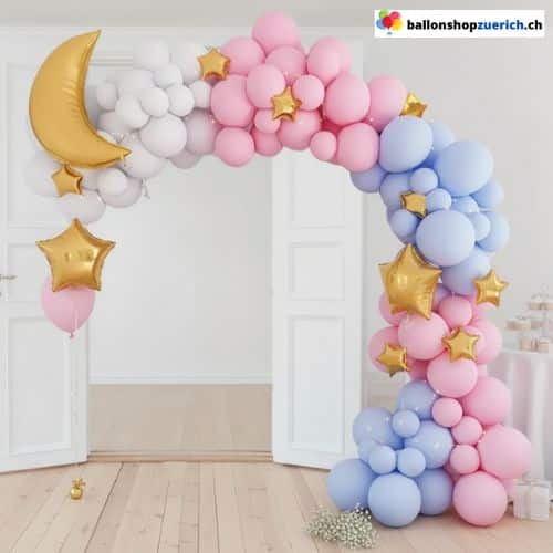 Die Kombination aus Pastell Pink, Blau und Weiss wird durch goldene Sterne und den grossen Mond ergänzt. So entsteht ein magischer Look, ideal für romantische oder festliche Anlässe. Eine Deko, die garantiert für strahlende Gesichter sorgt.