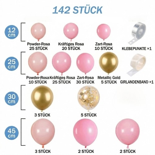 Kombiniere zartes Rosa, kräftiges Pink und festliches Gold zu einem optischen Highlight, das deine Gäste verzaubern wird. Ob für den nächsten runden Geburtstag, eine elegante Baby Shower oder eine romantische Hochzeit – die verschiedenen Ballongrössen und die glitzernden Gold-Konfetti-Ballons sorgen für Tiefe und einen professionellen Look. Mit den riesigen 45 cm Ballons setzt du zudem imposante Blickfänge an den Enden deiner Girlande.