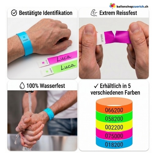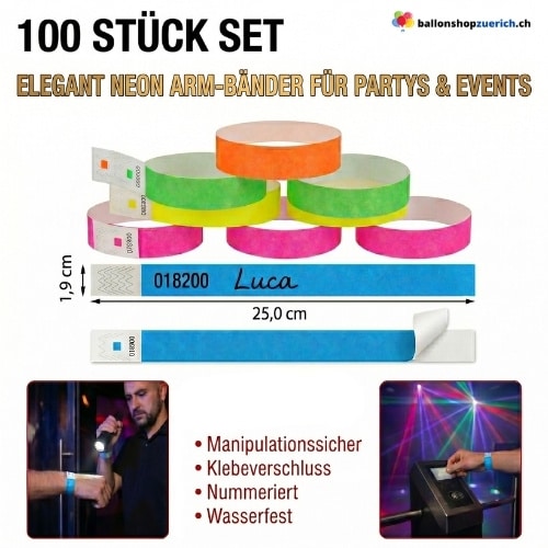 - 100× Eintrittsbänder in der gewählten Farbe (Tyvek)