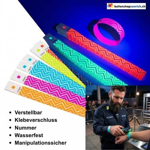 Sichere Einlasskontrolle mit spektakulärem Leuchteffekt: Diese 100-teiligen Tyvek-Sets im dynamischen Zickzack-Design sind speziell für Events mit Schwarzlicht entwickelt. Die fluoreszierenden Farben garantieren maximale Sichtbarkeit und Sicherheit in dunklen Umgebungen.