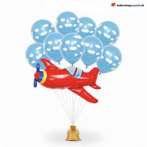 Der Kontrast macht dieses Set so besonders: Das leuchtende Rot des Doppeldeckers sticht vor dem sanften Hellblau der Wolken-Ballons wunderschön hervor. Mit einer Spannweite von fast einem Meter ist das Flugzeug ein beeindruckender Hingucker, während die zehn Latexballons für die nötige “Himmel-Atmosphäre” sorgen.