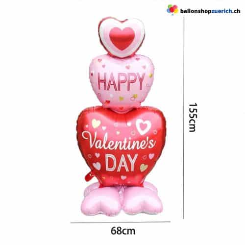 Warum nur ein Herz schenken, wenn es auch drei sein können? Dieser spektakuläre Steh-Ballon vereint ein rotes Herz an der Spitze, ein rosafarbenes mit “Happy”-Schriftzug in der Mitte und ein grosses rotes Herz mit “Valentine’s Day” unten. Dank der stabilen pinken Basis steht er frei im Raum – ganz ohne Helium. Eine romantische Überraschung, die garantiert für strahlende Augen sorgt.