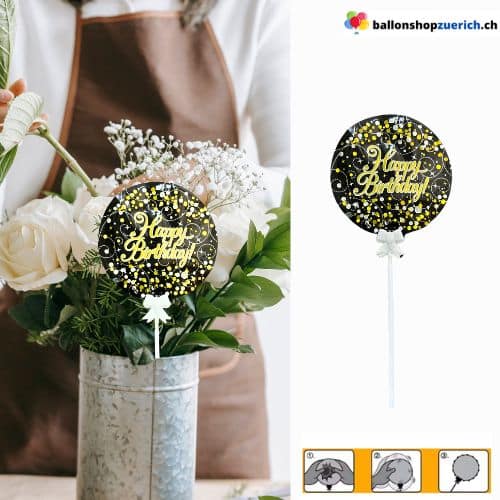Kleiner mini Folieballon Happy Birthday Geburtstag „Gold Konfetti“ Luftballons als Tischdekoration, als Dekoration für den Blumenstrauss Ballon oder die Geburtstagstorte oder eines Geschenks mit Stab