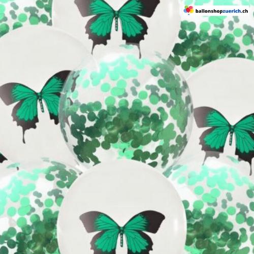1 Set: 5 Schmetterlingsballons Grün Blau oder Rot und 5 Konfetti Ballons dementsprechend Grün Blau oder Rot